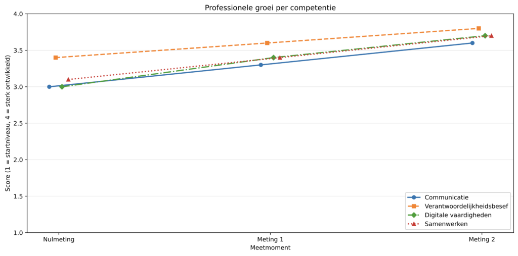 Ook in mijn communicatie maakte ik grote stappen. Door presentaties, overlegmomenten en het schrijven van manuals en een onboarding, leerde ik om mijn boodschap helderder, gestructureerder en professioneler over te brengen. Ik werd bewuster van toon, timing en duidelijkheid, en merkte dat mijn ideeën daardoor beter werden ontvangen.